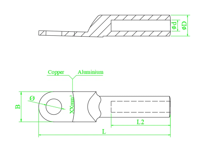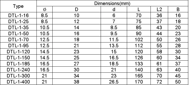 DTL series aluminum copper connection terminals are suitable for aluminum core cables of power distribution devices and transition connectors of electrical equipment. DL Aluminum is used for aluminum terminal connection of aluminum core cables and electrical equipment. DT Copper terminal Used for electrical devices with copper terminals. DT copper terminal for copper core cable and electrical equipment copper terminal connection, the product adopts friction welding process, our company supply copper aluminum terminal and wire clamp products have the following characteristics: high welding strength, excellent electrical performance, electric couple corrosion resistance, long service life, never break, high safety.