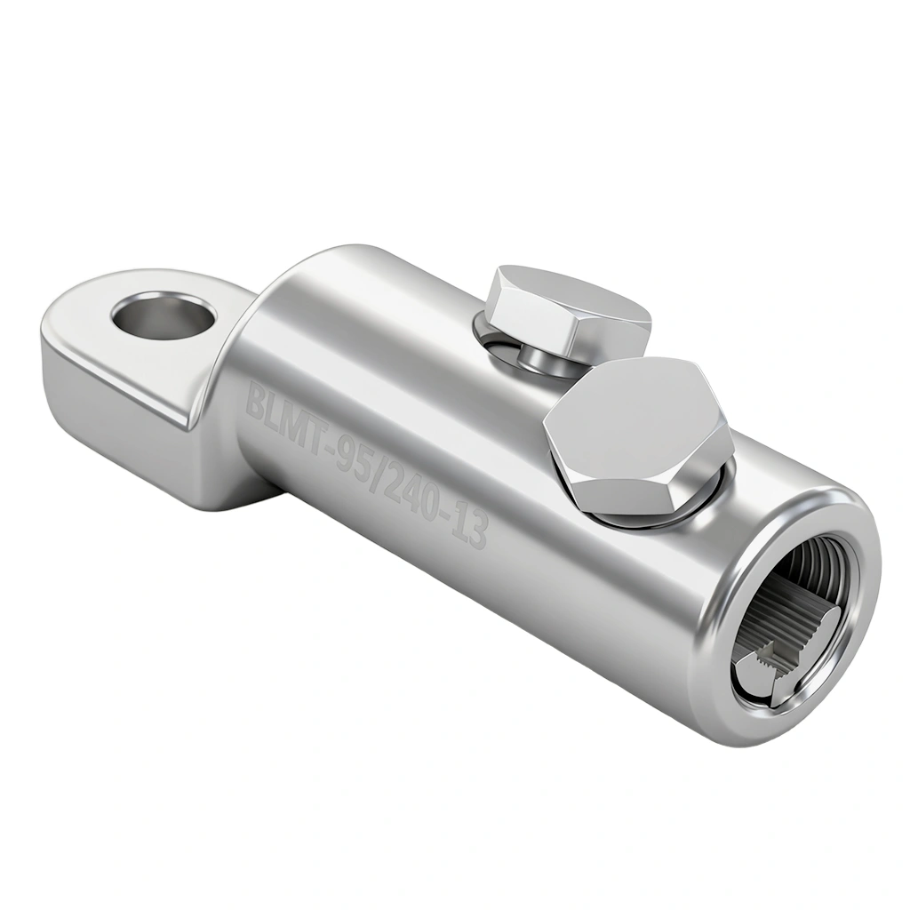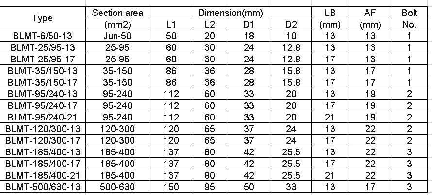 BLMT shear bolted lug is connection type power fitting between the wire and equipment, mainly used for non-bearing connection in insulated wire, aluminum wire, ACSR and copper wire.The terminal body is made of a high strength tinned aluminum alloy, and the inner surface of the conductor hole has a mesh concave design. Double shear head bolts are made of special aluminum alloy and are treated with high quality lubricants and are equipped with a special contact ring which can not be removed once the bolt head is cut off. Insert or remove the special insert to adjust the scope of the applicable conductor. These inserts have longitudinal stripes and a positioning slot.This product model is streamlined, suitable for different diameter connection. For example: three models can cover from 25mm2 to 240mm2 conductor.The terminals are suitable for outdoor and indoor applications and can provide different bolt size specifications.